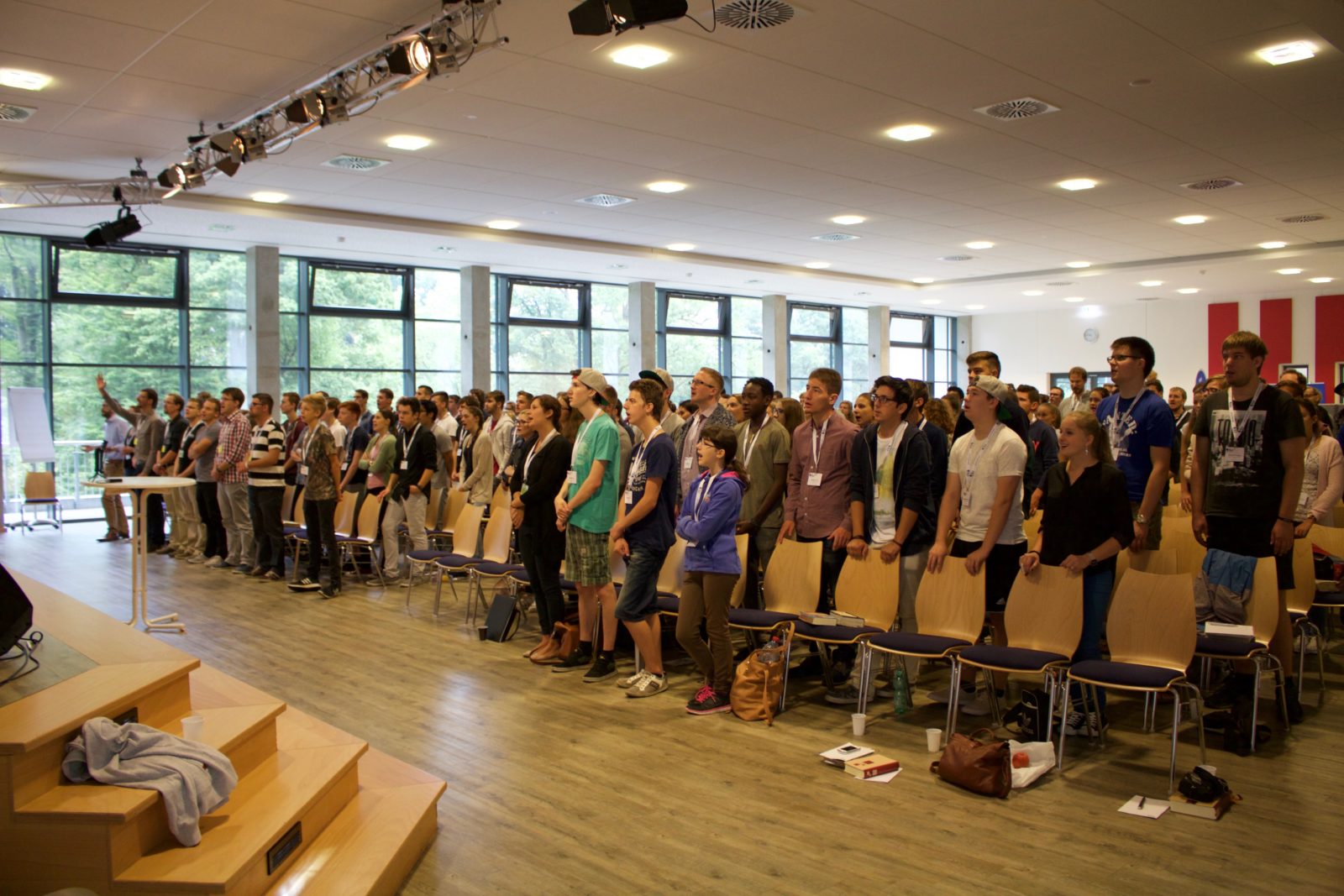 Da war ich also, eingeflogen. Das erste Mal. Unzeitgemäß in doppelter Weise: Weit über dem Alterslimit, mitten am Samstag nach dem Morgenvortrag. Junge Menschen zwischen 16 und 30 Jahren drängeln sich vor die Aula zum Fototermin.