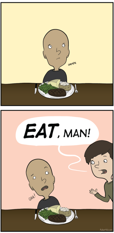 Adam4d.com ist mein frommer Lieblings-Comic-Darsteller. Er ist Meister darin, schwierige theologische Fragen in kurzen Dialogen abzubilden.[1] Hören wir einem Zwiegespräch zu, das am gedeckten Tisch geführt wird.